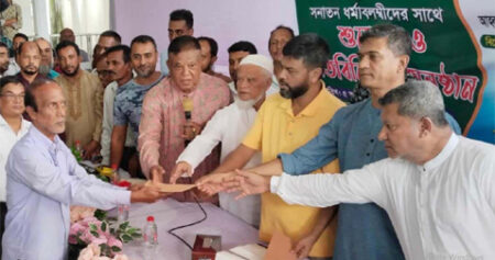 এসময় উপজেলা বিএনপির সিনিয়র যুগ্ম-আহবায়ক কপিল উদ্দিন সরকার, উপজেলা সাবেক যুগ্ম-সাধারণ সম্পাদক আলমগীর সিদ্দিকী, পৌর যুগ্ম-আহবায়ক এমজি কিবরিয়া মজুমদার, মনির আহাম্মদ খোকন ও আবুল খায়ের বাবুল মজুমদার, সদস্য সচিব আবদুল লতিফ, রাধানগর ইউনিয়ন আহবায়ক রবিউল হক চৌধুরী মাহবুব, মহামায়া ইউনিয়ন আহবায়ক ফজলুল করিম লিটন, ঘোপাল ইউনিয়ন আহবায়ক মোহাম্মদ মোস্তফা, উপজেলা যুবদলের আহবায়ক কাজী জসিম উদ্দিন, যুগ্ম-আহবায়ক হাফেজ মো: সোহরাব হোসেন ও আবদুল মোমিন, উপজেলা স্বেচ্ছাসেবক দল আহবায়ক জাফর হোসেন মজুমদার, সদস্য সচিব দেলোয়ার হোসেন রাজিব, পৌর যুবদলের সাবেক সাধারণ সম্পাদক আইনুল করিম বাবু, জেলা ছাত্রদল সদস্য শাহাদাত ও নাজিম উদ্দিন, পৌর যুবদল আহবায়ক জয়নাল আবেদীন, যুগ্ম-আহবায়ক মো: আলমগীর হোসেন ও শাকিল, উপজেলা শ্রমিকদল সভাপতি শহীদ উল্লাহ, পৌর শ্রমিকদল আহবায়ক হোনা মিয়া, উপজেলা ছাত্রদল আহবায়ক মো: নাদিম উদ্দিন সহ বিএনপি ও এর অঙ্গসংগঠনের শতশত নেতাকর্মী। শেষে রফিকুল আলম মজনু ৩৫টি হিন্দু পরিবারের মাঝে অর্থ সহায়তা উপহার হিসেবে প্রদান করা হয়।